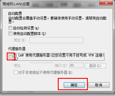 - 第四步:把為LAN使用代理服務器的對勾去掉,點擊確定。