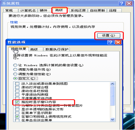 解決方法:按鼠標右鍵點擊“我的電腦“,點擊”屬性-高級-(性能)設置“,勾選”托拉時顯示窗口內容“即可。